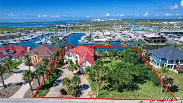 Beautiful custom built Mediterranean style home sits on 2 lots and Redfish Bay in Pelican Cove, Aransas Pass. This 4096 sq ft home has 4 bedrooms and 4.5 bathrooms, with 3 car garage. Large open floor plan living and dining area, with gourmet kitchen and a dumbwaiter. Primary bedroom overlooks the bay with huge walk-in closet, adjoining laundry room, separate tub and shower, dual vanities and lots of counter space and storage. Sprinkler system, double lot on the water, bulkhead, 2 boat lifts, Trex dock an