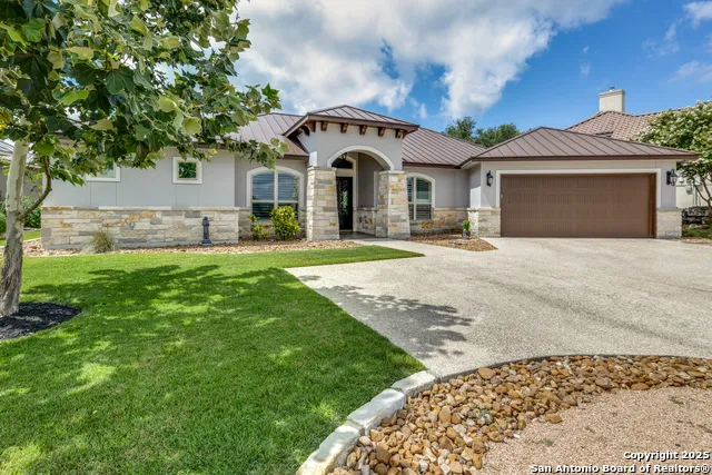 Welcome to one of the most breathtaking views in the Texas Hill Country! Nestled in the prestigious gated community of The Ridge at Tapatio Springs, this stunning 4-bedroom, 3-bath home with a dedicated study offers elegance, comfort, and style in every detail. Step inside to an expansive open-concept living area with soaring 14-foot ceilings adorned with cedar beams, striking stone columns, and a beautiful stone fireplace. The 8-foot custom doors and large windows perfectly frame the unobstructed hill country vistas, creating a warm and inviting atmosphere. The gourmet kitchen is ideal for entertaining, featuring a large center island, abundant counter space, and high-end Bosch appliances-all overlooking the covered outdoor patio. The spacious primary suite showcases sweeping panoramic views and is complemented by a luxurious en-suite bathroom designed for ultimate relaxation. This spa-like retreat features elegant finishes, a dual vanity, a large walk-in shower, and a soaking tub-perfect for unwinding at the end of the day. A unique highlight is the pair of his-and-hers walk-in closets, thoughtfully connected to provide generous storage and effortless functionality. The home also boasts an oversized garage with ample storage, a sleek epoxied floor, and plenty of room for your golf cart. Additional upgrades include a newly installed water softener, ensuring both comfort and convenience throughout. Enjoy exclusive access to The Ridge's private amenities including a sparkling pool, clubhouse, and fitness center-all just moments from the renowned Tapatio Springs Golf Resort. This is Hill Country living at its finest!