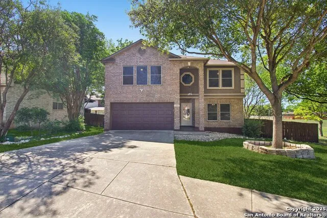 Nestled at the end of a quiet cul-de-sac in Dove Meadows, this spacious two-story home offers the perfect blend of comfort, style, and convenience. With 4 bedrooms, 2.5 bathrooms, and a beautifully shaded front yard, this home is ideal for families or anyone looking for a tranquil retreat with plenty of space. Step inside to find an inviting open layout with generous living areas, natural light, and modern finishes. The large kitchen features ample cabinet space and flows seamlessly into the dining and family rooms-perfect for entertaining with a half bathroom downstairs perfect for guests. All bedrooms & a full guest bathroom are located upstairs, including a spacious master suite with a private renovated en suite bathroom. Some of the homes updates include: New roof installed in 2021, staircase & hallway carpet 2021, new water heater 2023, master bathroom renovated in 2022 and new tile floor through-out the first floor installed in 2017. Enjoy the Texas sunshine from your oversized backyard, complete with a privacy fence and mature trees offering plenty of shade and charm. Deck has been meticulously maintained with an added steel roof on the back patio/deck in 2017, great for backyard gatherings and BBQ's. The two-car garage, extended driveway, and stone-edged landscaping in the front yard add great curb appeal. Situated near top-rated SCUCISD schools, parks, shopping, and easy access to I-35 and Randolph AFB, this home offers both comfort and convenience in one of the most sought-after neighborhoods in Schertz.