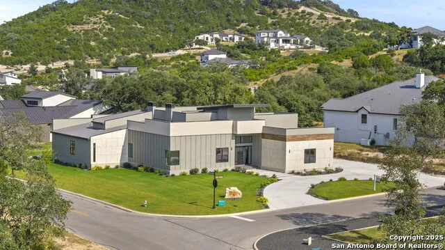 A statement of modern architecture and refined Hill Country living, this custom single-story residence in The Canyons at Scenic Loop is constructed with 2x6 exterior framing, enhanced insulation, and single-slope standing seam metal roofing for superior efficiency, longevity, and clean contemporary lines. Offering 3,719 sq. ft. of intentional design, the home features gallery-height ceilings, expansive walls of glass, and seamless indoor-outdoor connection. The open living space is anchored by a striking feature wall with a linear fireplace, flowing into a chef's kitchen with European-inspired cabinetry, a waterfall black granite island, 48" professional gas range with pot-filler, double ovens, and a hidden walk-in pantry. The owner's retreat evokes a spa-like sanctuary with a sculptural soaking tub, oversized glass shower, and warm natural textures. Outdoor living becomes an everyday experience with a resort-style pool and elevated spa framed by water and fire features, covered lounge terrace with fireplace, outdoor kitchen, and poolside shower beneath heritage oaks-where minimalist design and luxury craftsmanship meet at the highest level.