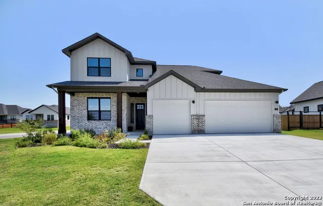 Welcome home to this stunning two story modern farm house with 4 bedrooms, 2.5 baths, 2537 square feet, an oversized two-car garage, and a covered patio. Located in Woodbridge Farms, a quaint modern farmhouse community located in the sleeper city of La Vernia with exemplary schools and low tax rates. This custom finished home offers an open concept floor plan perfect for modern living, providing plenty of space, and beautiful natural lighting. The chef's kitchen features stainless steel appliances, solid counter tops, cooktop, and work island . The split primary bedroom is located down stairs providing privacy and features bay windows, coffered tray ceiling with a ceiling fan, and plenty of space for relaxation. The primary bath offers upgraded designer tile flooring, spacious shower, soaker tub, dual sink vanity, framed mirrors, and a huge walk-in closet. This home is a perfect blend of comfort, style, and luxury. The covered patio provides the perfect place to relax and unwind, and the oversized two-car garage provides ample space for extra storage. This gorgeous hill country master-planned community has been thoughtfully landscaped with sidewalks, multiple parks, splash pad, basketball court and more. We invite you to embrace the pride of La Vernia and the traditions of living in the South! Come home to a Journey Home, built with integrity and a custom mindset. Built for what comes next! **Interest rate subject to change based on loan type and timing.