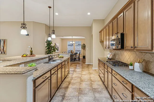 Step into comfort, style, and convenience in this beautifully maintained 4 bedroom, 3.5 bath single story home located in the exclusive gated community of Prospect Creek at Kinder Ranch. With two spacious primary suites, including one with a zero threshold walk-in shower, this home is ideal for multi generational living or offering guests their own private retreat. At the heart of the home, you'll find an open concept living area featuring a stunning granite island, custom wood cabinetry, and a walk-in pantry that's perfect for the family chef. The dedicated home office makes working from home both efficient and comfortable, while the oversized laundry room provides room for an extra refrigerator and plenty of storage. Step outside to your covered patio surrounded by lush landscaping, an ideal space for morning coffee or peaceful evenings. Enjoy scenic walking paths and all the natural beauty Kinder Ranch has to offer right from your doorstep. The three car tandem garage includes built-in storage, dual 50 gallon water heaters, and a water softener, providing thoughtful convenience and peace of mind. This move in ready home offers incredible value in one of the most desirable neighborhoods in the area. Schedule your private showing today and see firsthand why this Kinder Ranch home is even more impressive in person.