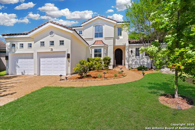 Welcome to 19211 Tierra Cove, a Refined Spanish Residence in the Golf Course Community of the Woods at Sonterra with Resort-Caliber amenities and a custom Keith Zars Swimming Pool. Situated on an expansive 0.38-acre homesite within an exclusive guard-gated community, this distinguished Spanish-style home seamlessly blends architectural elegance with modern refinement. Encompassing 3,354 square feet of thoughtfully designed living space, this two-story residence offers four generously appointed bedrooms, four and a half luxurious baths, and a dedicated office-crafted for both grand entertaining and intimate everyday living. Soaring ceilings and exposed wood beams set a tone of understated grandeur, while fresh interior paint and curated designer light fixtures elevate the ambiance throughout. The gracious living spaces are anchored by a timeless Spanish-style fireplace, while wood-look flooring adds warmth and continuity. At the heart of the home, the chef's kitchen exudes sophistication with pristine quartz countertops, crisp white cabinetry, and premium stainless steel appliances (2021). Spa-inspired marble-tiled bathrooms accompany each bedroom, with the primary suite offering a sanctuary of its own-complete with a classic clawfoot soaking tub and elegant finishes. Additional features include a water softener system, a 2020 HVAC replacement, and impeccable design continuity across every room. The home's exterior is equally captivating. A concrete tile roof, smooth stucco facade, and wrought iron designer sconces speak to its Spanish heritage. The grounds are meticulously landscaped with mature oaks, curated planting beds, and a full sprinkler system. Step outside to a private oasis featuring a Keith Zars swimming pool and spa, flagstone walkways, and a covered patio ideal for alfresco living. The oversized two-car garage offers ample storage without compromising aesthetics. Situated on a cul-de-sac lot across the street from The Vineyard Shopping center - home to Whole Foods, Target, Black Swan Yoga, Chipotle, Panera, LA fitness and more. Located within the coveted North East Independent School District and Zoned to Reagan High School. This is a rare offering-where classic architecture, curated upgrades, and a premier location converge to create a residence of exceptional character and comfort.