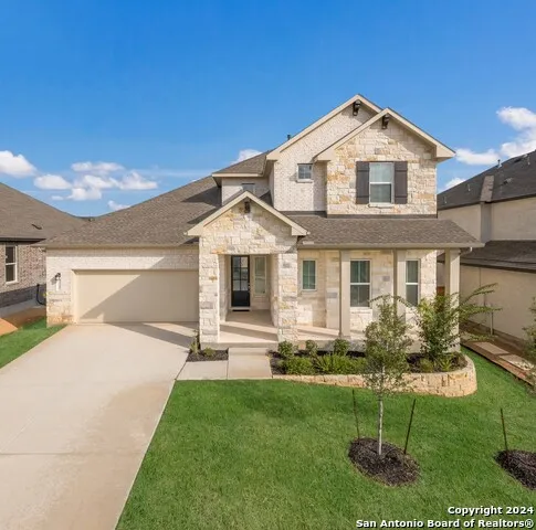 ** MOVE-IN READY! ** This hill country style home boasts a charming front porch with a luxurious 8' front door. The primary bedroom and a second bedroom are conveniently located on the first level, along with two full bathrooms. The plan features 8' tall interior doors and 10' ceilings on the first level, with the family room showcasing impressive 20' ceilings and a fireplace. The island kitchen offers built-in stainless steel appliances and a gas cooktop, while the dining room is extended 3' for larger gatherings. Outside, the extended covered patio includes a ceiling fan and gas stub out for future grilling. Upstairs, you'll find 2 bedrooms, a game room, and a separate media room. Situated in the desirable Veramendi community, with nearly 500 acres of parks, a community pool, and more. Ideal for active lifestyles and family living!