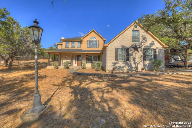 Escape to the tranquility of the Hill Country with this exquisite 2,505 sqft. 4 bed/2.5 bath home. Nestled on a sprawling 1.03-acre lot adorned with majestic oak trees and enveloped by a privacy fence, this property offers the perfect blend of serenity & comfort. Upon arrival, a solar-powered iron gate welcomes you, leading to a spacious side-load, 2-car garage & a winding driveway providing ample parking space. The property boasts a RV cover & a convenient storage shed, catering to all your storage needs. Inside, the well-appointed kitchen seamlessly connects to the inviting family room, creating an ideal space for gatherings and entertaining. The 1st floor owner's suite is generously sized, featuring a walk-in closet & an en-suite bathroom complete with a luxurious garden tub, separate shower, & dual sinks. Upstairs, you'll discover 3 more spacious bedrooms & an additional bath, ensuring plenty of room for family and guests. Discover the joys of country living in this meticulously designed & well-maintained home.