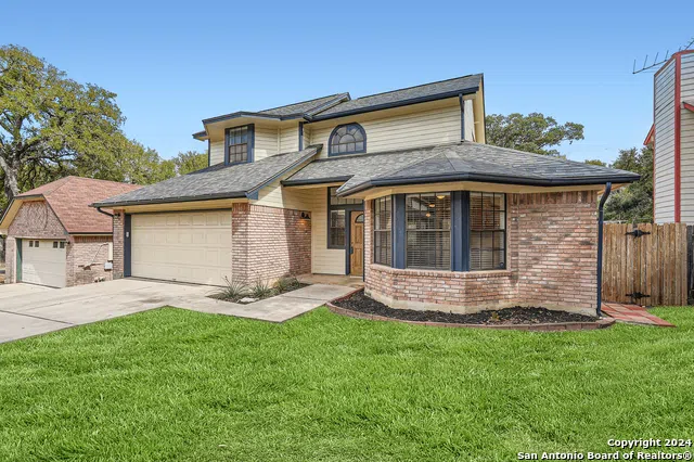 Fabulous updated home in great neighborhood with architectural appeal! Seller did lots of refreshing to include all new interior paint and new carpet. There is new lighting, and new fixtures as well as a new hot water heater. The 30 year roof and HVAC are also newer and HVAC still has transferable warranty until 2028. This lovely house has high vaulted ceilings in the family room and is graced by a warm brick fireplace and laminate floors. There is a formal dining room as well as an eat in kitchen with lovely bay window for light. Stove and dishwasher are newer and kitchen and breakfast area are all tiled along with the bathrooms. There is a brand new microwave! The primary bedroom is downstairs and features a walk in closet and the bath has a tile surround garden tub and double vanities. The other two bedrooms are upstairs along with a loft/gameroom with wood rail spindles open to below. The ductwork was also recently replaced. Outside you will find a covered pergola/deck and a spacious backyard. Located close to Randolph AFB and all the shopping at the Forum where you will find everything you need. Make this lovely home yours today!