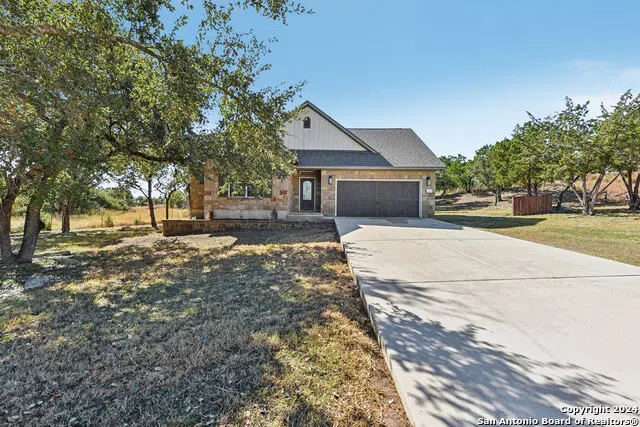 This handsome home, built by Three Oaks Homes in the highly sought-after community of Woodcreek, has many beautiful things to offer! It is located on a .50-acre lot with no direct back neighbors where Hill Country sunsets span for miles. There are lush green panoramic views all around. It is an incomparable little gem on a private road. Many trees offer shade during Texas summers. Your foyer is adorned with high tray ceilings, gorgeous tile floors, and an ornate front door. Your living room is bright and airy, with high ceilings and a wall of windows that allow natural light to flow through the house. It also has a cozy fireplace with a floor-to-ceiling sandstone wood-burning fireplace. Imagine curling up with a good book next to the roaring fire on a chilly Texas day. The kitchen features Alder cabinets, SS appliances, granite countertops, a built-in microwave, a lazy susan in one of the bottom cabinets, a tile backsplash, an island, a breakfast bar with stone accents, a smooth cooktop stove, and a breakfast area overlooking the backyard. The primary bedroom is spacious and serene. You'll love recharging in this space. Your ensuite features French doors leading to a double extended vanity with granite counters, a walk-in shower with a bench, and a walk-in closet with thoughtful rails and shelves. Spacious secondary rooms. Your secondary bath features a single elegant vanity and tub/shower combo. One of the many outstanding features of this property is the extended patio, which is a tree-covered backyard. This space is ready for your finishing touches and perfect for a BBQ. It has a NEW roof, HVAC, and Grinder pump. It is situated on a double lot with a large ranch behind and on the side of the property. This home is located in a USDA-eligible area. Take a short drive to Jacobs Well, or have a fun day exploring Wimberley.