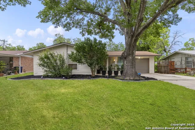 Nestled in the heart of East Terrell Hills, this charming 3-bedroom, 2-bath home effortlessly blends style, comfort, and convenience. From the moment you arrive, the serene painted brick exterior and a majestic heritage oak tree create undeniable curb appeal and a welcoming first impression. Inside, the efficient layout offers a seamless flow that instantly feels cozy and inviting beginning with the open living room which bathed in natural light thanks to floor-to-ceiling windows. The thoughtfully designed kitchen features abundant cabinetry, recent lighting upgrades, and opens onto a beautifully styled dining area adorned with designer lighting and elegant wallpaper. French doors lead to a fantastic covered patio, ideal for relaxing in the shade or entertaining guests in the private, spacious backyard. All three bedrooms are generously sized, filled with natural light, and have been freshly repainted and fitted with new ceiling fans. Thoughtfully set back from the road, this well-cared-for home offers a serene escape, yet is just minutes from Alamo Heights, The Pearl, Ft. Sam Houston, the San Antonio Airport, and more. A one-car garage and an extended driveway with a parking pad add extra convenience to this gem of property.