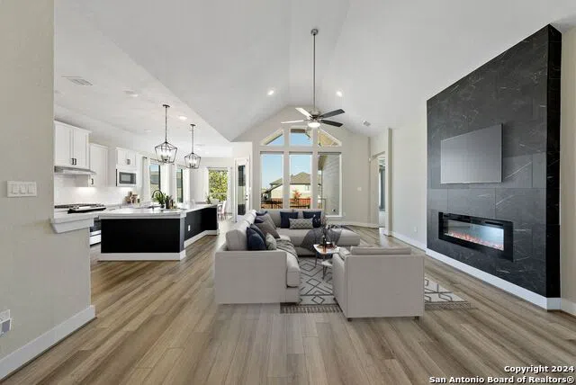 Welcome to your dream home in Schertz, where comfort meets style. This stunning 4 bedroom, 3 bath home with a dedicated study, offers a spacious and functional layout. The elegant brick and stone exterior provides fantastic curb appeal, while the interior features an open and bright design with high ceilings and modern motorized blinds for added convenience. The heart of the home is a gourmet kitchen with stainless steel appliances, a large island ideal for casual dining and gatherings, and a cozy fireplace that sets the perfect ambiance for chilly winter evenings. The primary suite adds a touch of luxury with dual vanities and a walk-in shower. Step outside to enjoy the covered back patio, perfect for entertaining or weekend BBQs. This property also gives you access to an amenity center with a sparkling pool, playground, and a state-of-the-art fitness center to support an active lifestyle. The refrigerator, washer, and dryer are included, making this home truly move-in ready. Now is your chance to own this must-see property. Don't miss out on this incredible opportunity!