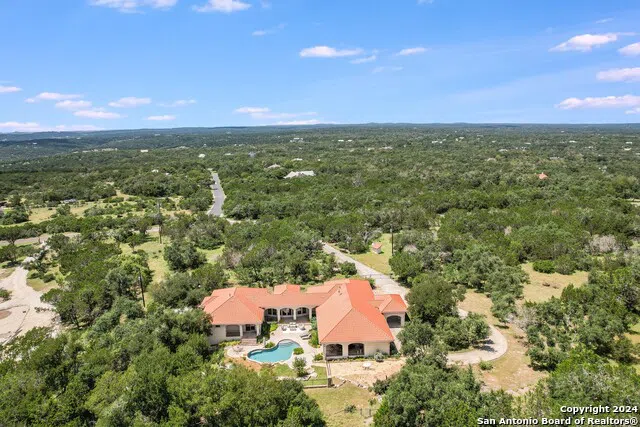 Welcome to a stunning Mediterranean retreat nestled in the Hill Country. This custom-built home offers luxury, comfort, and breathtaking views at every turn. As you enter through grand double doors, the foyer greets you w/dramatic views of your private backyard oasis, w/sparkling pool that beckons for a refreshing dip. The home's exquisite design is evident as you pass the cozy library, adorned with a wall of custom built-ins. Travertine floors stretch throughout most of the home, adding elegance and warmth. The heart of this home is the true chef's kitchen, an entertainer's dream. Equipped with a Thermador 6-burner range, Sub-Zero refrigerator, and expansive center island, this kitchen is designed for function and style. The open floor plan seamlessly connects the kitchen, dining room, and living room, all offering stunning views of the pool. The home's layout wraps around this central outdoor space, creating a harmonious flow between indoor and outdoor living. On one side of the home, you find 2 bedrooms, sharing a bath. The other side of the home hosts 2 secondary bedrooms and a bath, along w/a versatile craft room that connects to the laundry area. The primary suite is a true sanctuary, featuring a sitting area w/ picturesque views of the pool, a walk-in closet, an a luxurious bath. The ensuite bath is equipped with built-in cabinetry, a double vanity, a soaking tub, and a separate shower, providing a spa-like experience at home. This property is not only beautiful but also practical, w/a rainwater collection system, well, an a oversized garage w/a car charging station. Additional features include a portico for extra covered parking. Located just a short drive from the River Mountain Ranch private water park, this home offers exclusive access to the pristine Blanco River, where you can enjoy the natural beauty and tranquility of the Hill Country. This custom Mediterranean home is more than just a residence-it's a lifestyle.