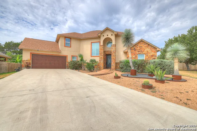 Don't miss this stunning home at the end of the cul de sac in gated Champions Village in New Braunfels. This custom home beckons you in with an impressive frosted glass and intricate oversized metal door leading into the stunning foyer and two story great room with views all the way to the backyard. The large kitchen is a chef's dream with double ovens, large island and breakfast bar, custom cabinets, granite counters and a walk in pantry that you just have to see. There are three bedrooms plus an office which could be easily used as a fourth bedroom as well as 2.5 baths with the primary located downstairs. You have to see the master bath walk in shower and closet complete with custom built ins. The great room is exceptional with a two story soaring ceiling and tons of windows that fills the home with light. Outdoors the front has easy xeriscaping and the back is an oasis with in-ground pool with water fountain and a cabana for relaxing, there are no neighbors behind you so the area is a very intimate space.